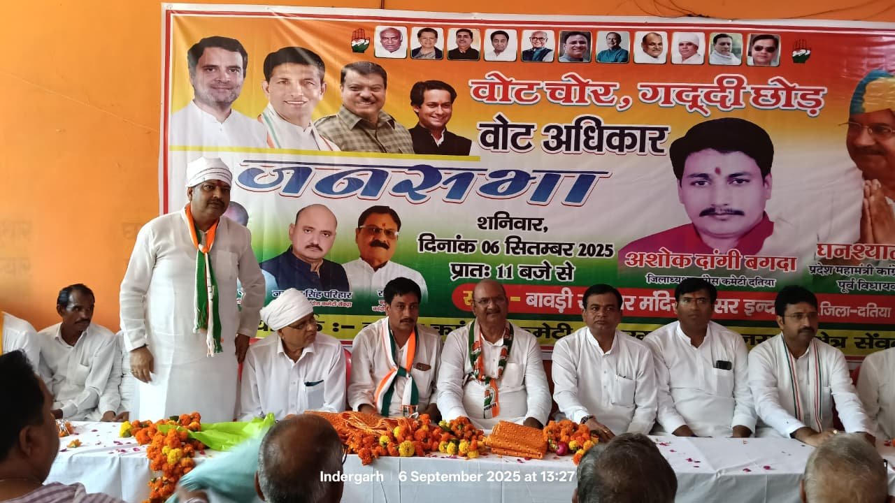 सभा को संबोधित करते हुए जिला अध्यक्ष अशोक दांगी, भांडेर विधायक फूल सिंह बरैया, पूर्व विधायक घनश्याम सिंह और पूर्व प्रदेश महासचिव कौशल यादव ने कहा कि “हमारे नेता राहुल गांधी ने भाजपा की वोट चोरी का सच उजागर कर दिया है। इसके बाद से भाजपा का असली चेहरा पूरे देश के सामने आ गया है। केंद्र और मध्य प्रदेश की भाजपा सरकार मतदाताओं का अपमान करते हुए वोट चोरी कर सत्ता में बनी हुई है।”